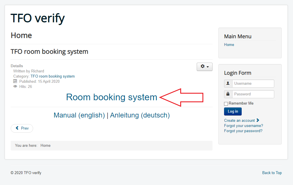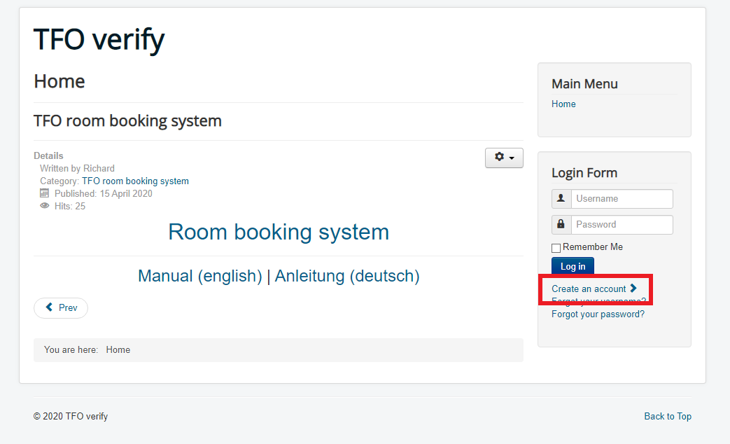 (3) Nachdem ihr auf den blauen "Register" Button geklickt habt sollte eine Bestätigungsseite erscheinen und ihr solltet eine Email mit euren Kontodaten bekommen. Geht dann bitte zurück auf die Startseite und klickt auf den Link "Room booking system" (oder klickt direkt hier: TFO room booking system)