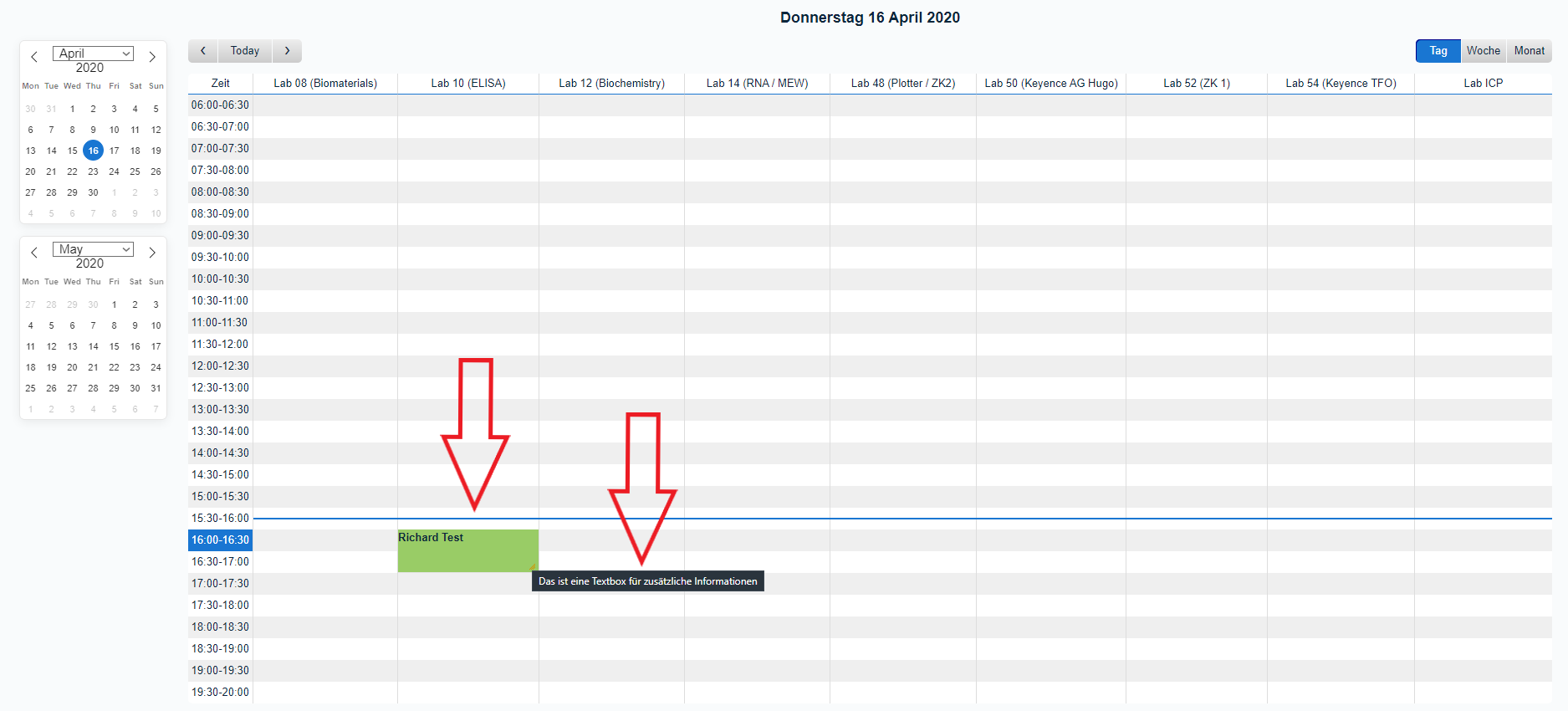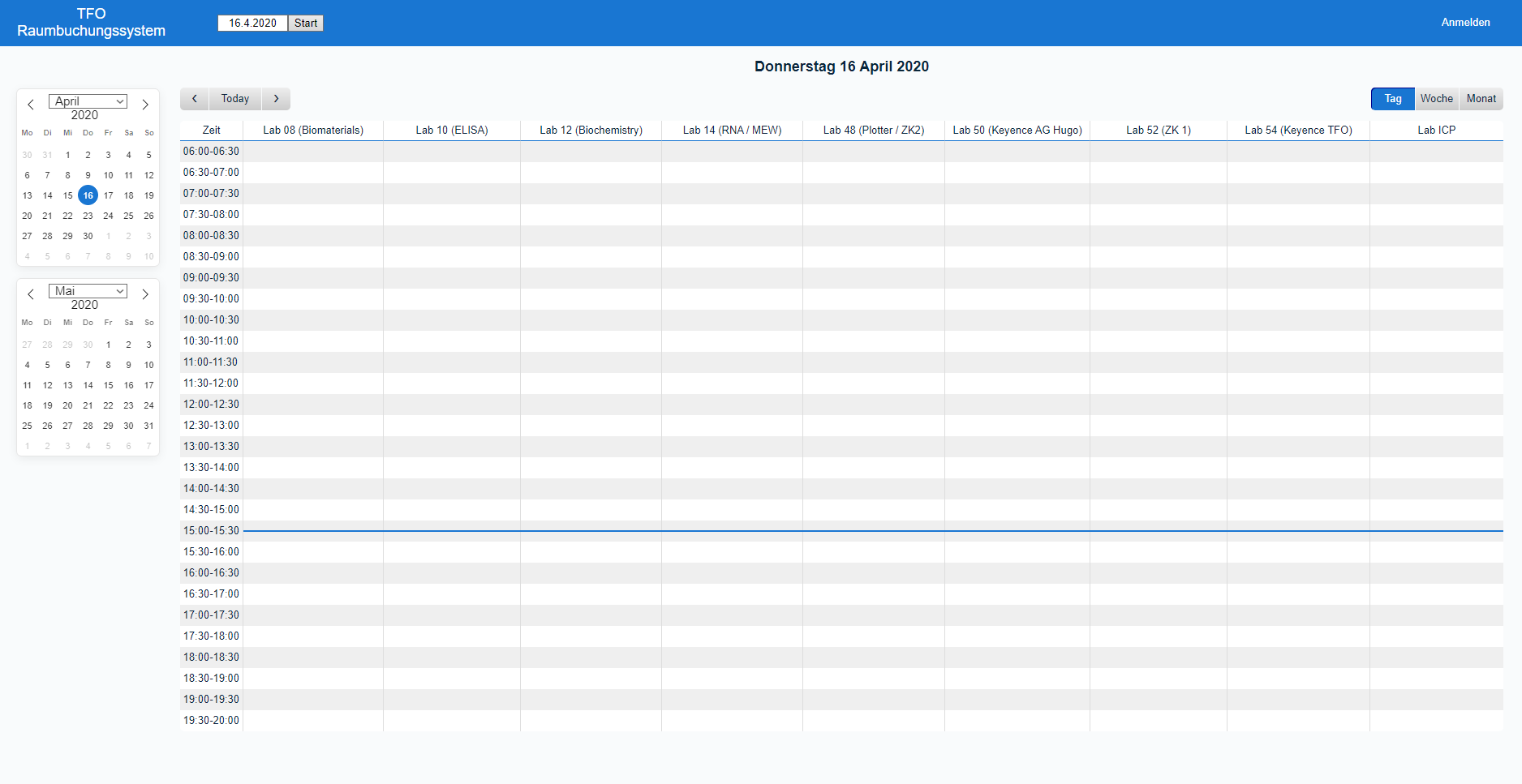 (1) Ihr solltet nun die Startseite des Kalenders/Buchungssystems sehen. Die Startansicht ist immer die Tagesansicht mit allen Einträgen des aktuellen Tages, aber ihr könnt problemlos zwischen Tages-, Wochen- und Monatsansicht wechseln. Ihr könnt auch auf ein beliebiges Labor in der oberen Reihe klicken, um eine Übersicht aller Einträge für dieses Labor zu erhalten.