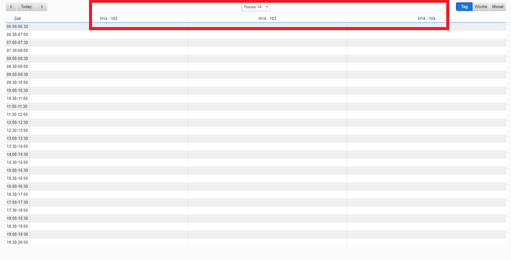 (1) Neben den Laboren in Haus 91 wurden nun auch die Räume in Haus 14 mit ins System aufgenommen. Für eine bessere Übersichtlichkeit wurden die Bereiche mit den einzelnen Räumen jedoch getrennt. Mittig über der Ansicht aller Kalendereinträge gibt es nun eine Auswahlliste in der ihr entweder die Labore (Labs) oder Haus 14 (House 14) mit den zugehörigen Räumen auswählen könnt um dann Einträge vorzunehmen.