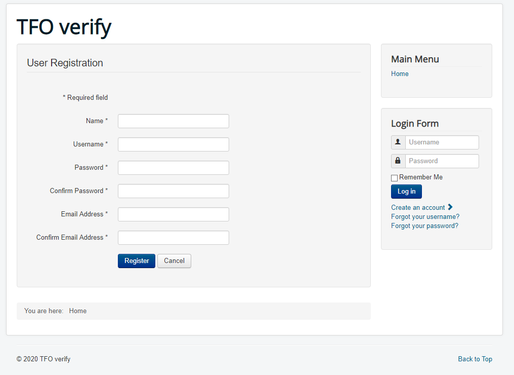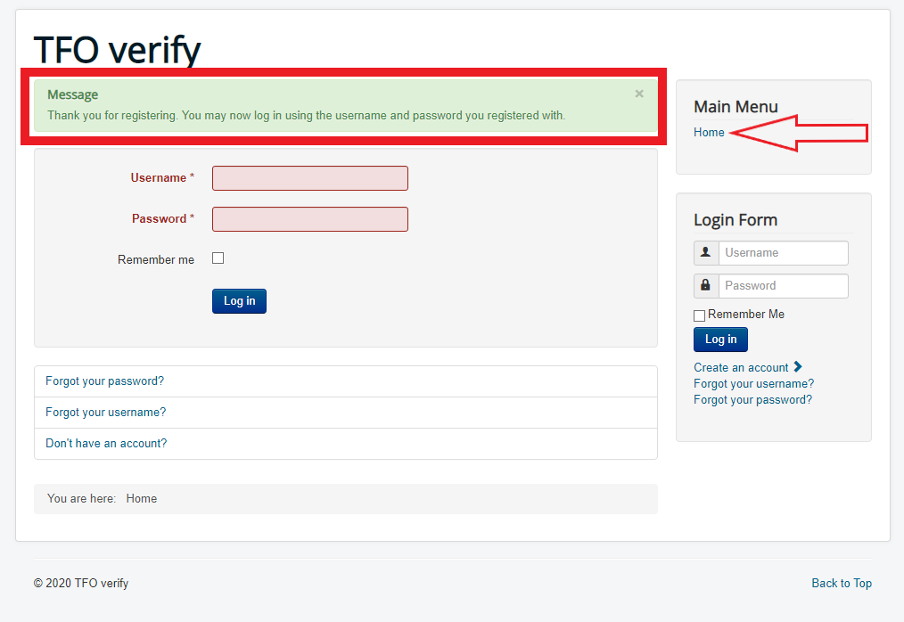 (3) Nachdem ihr auf den blauen "Register" Button geklickt habt sollte eine Bestätigungsseite erscheinen und ihr solltet eine Email mit euren Kontodaten bekommen. Geht dann bitte zurück auf die Startseite und klickt auf den Link "Room booking system" (oder klickt direkt hier: TFO room booking system)