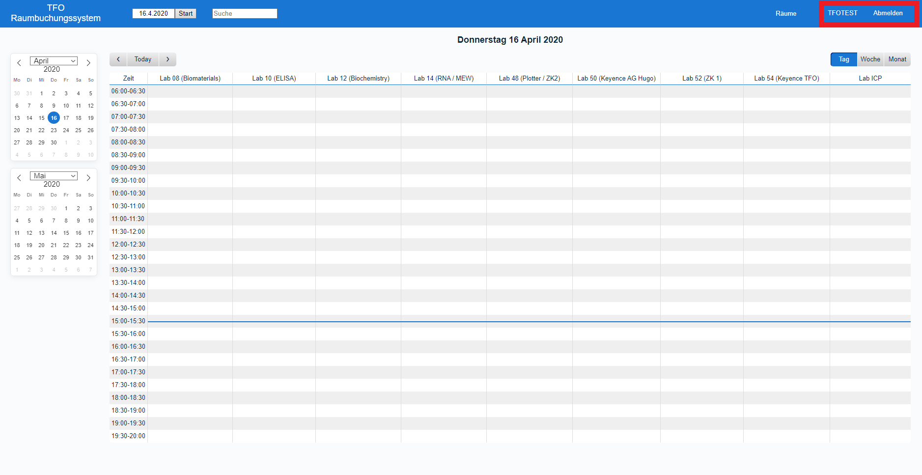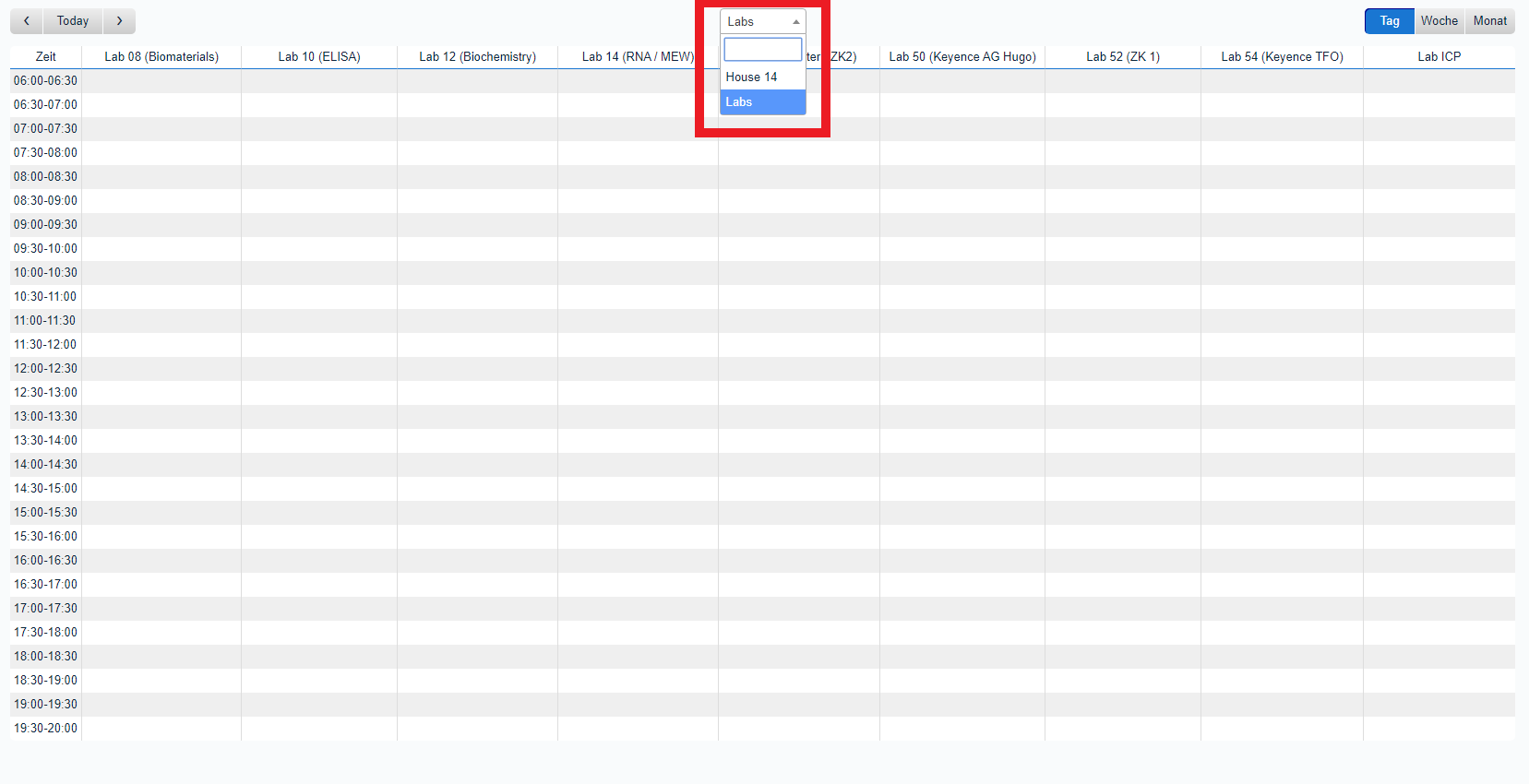 (1) Ihr solltet nun die Startseite des Kalenders/Buchungssystems sehen. Die Startansicht ist immer die Tagesansicht mit allen Einträgen des aktuellen Tages, aber ihr könnt problemlos zwischen Tages-, Wochen- und Monatsansicht wechseln. Ihr könnt auch auf ein beliebiges Labor in der oberen Reihe klicken, um eine Übersicht aller Einträge für dieses Labor zu erhalten.