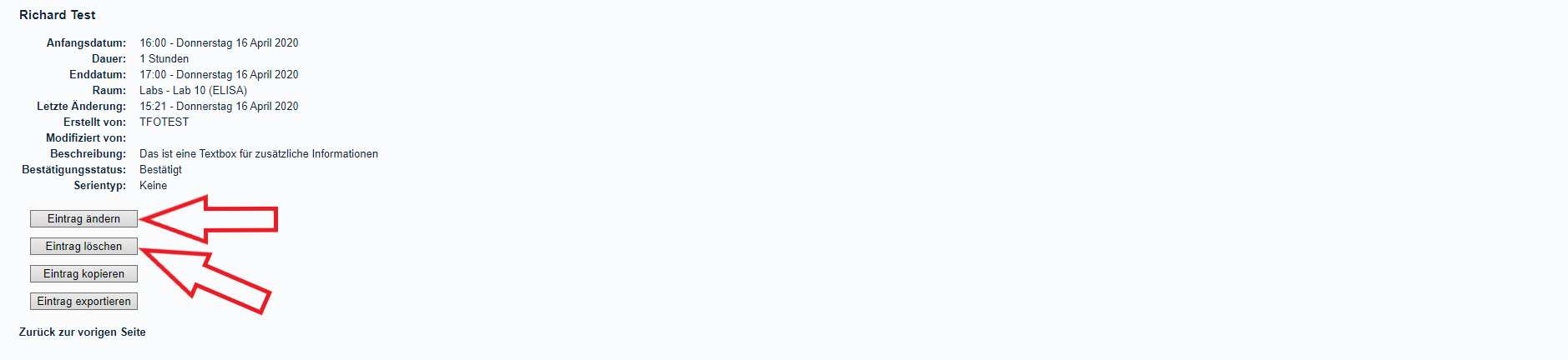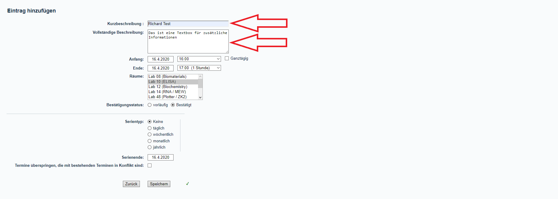 (3) Um nun einen Eintrag im Kalender vorzunehmen, klickt einfacht auf ein beliebiges Zeitfenster für ein Labor das ihr buchen möchtet. Danach erscheint eine "Eintrag hinzufügen" Seite. Diese Seite sollte hoffentlich ziemlich selbsterklärend sein. Schreibt einfach (zum Beispiel) euren Namen in das Feld "Kurzbeschreibung", zusätzliche Informationen können in die Textbox "Vollständige Beschreibung" geschrieben werden, wählt Start- und End-Zeitpunkt sowie den entsprechenden Raum aus und klickt unten auf den Button "Speichern". Falls ihr einen sich wiederholenden Eintrag erstellen wollt, wählt einfach die entsprechenden Optionen (Serientyp) aus. Der Bestätigungsstatus sollte normalerweise unverändert bei "Bestätigt" bleiben.
